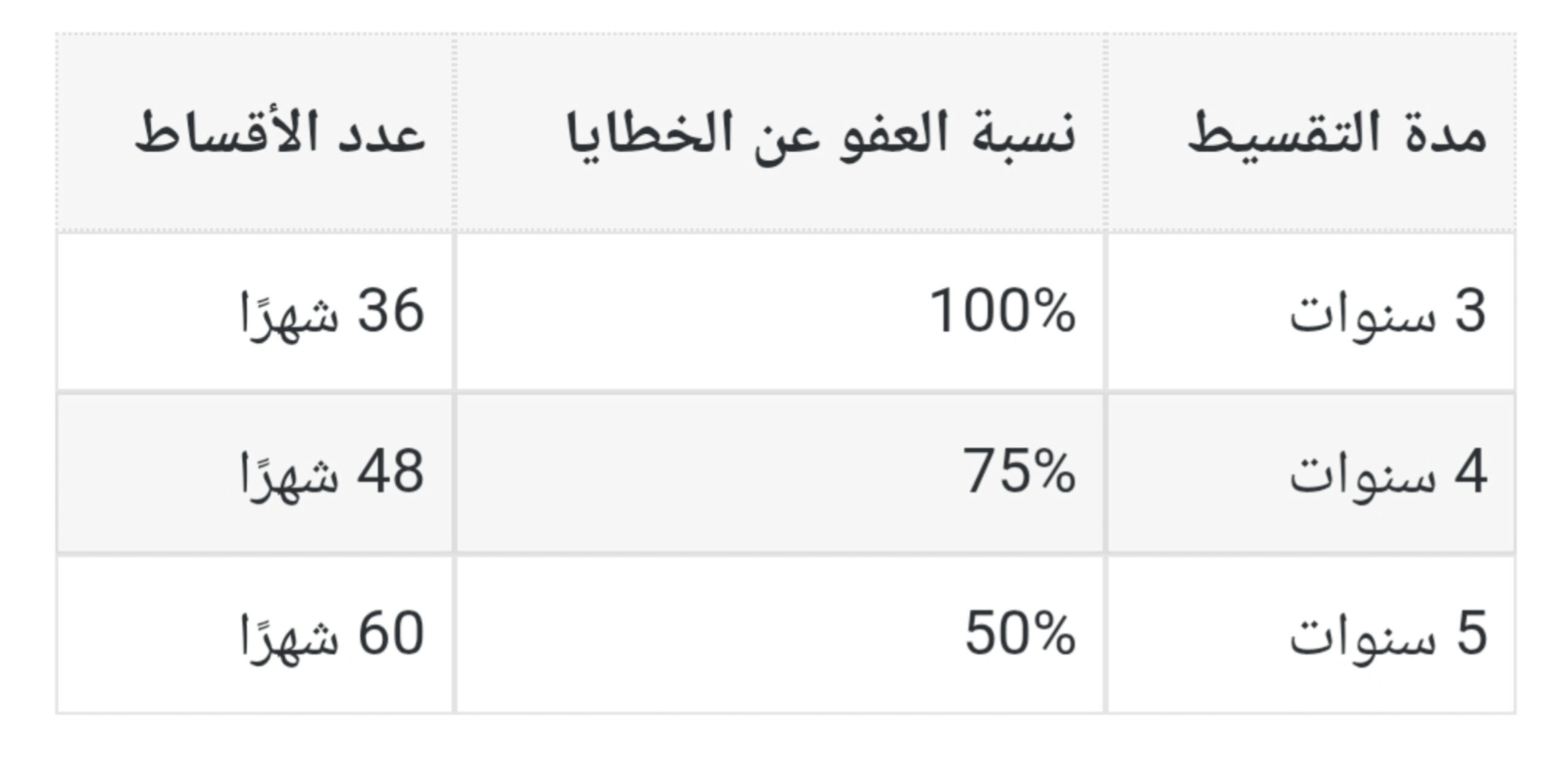 يشمل العفو في هذا النظام إسقاطًا كليًا أو جزئيًا للخطايا، حسب مدة التقسيط:
