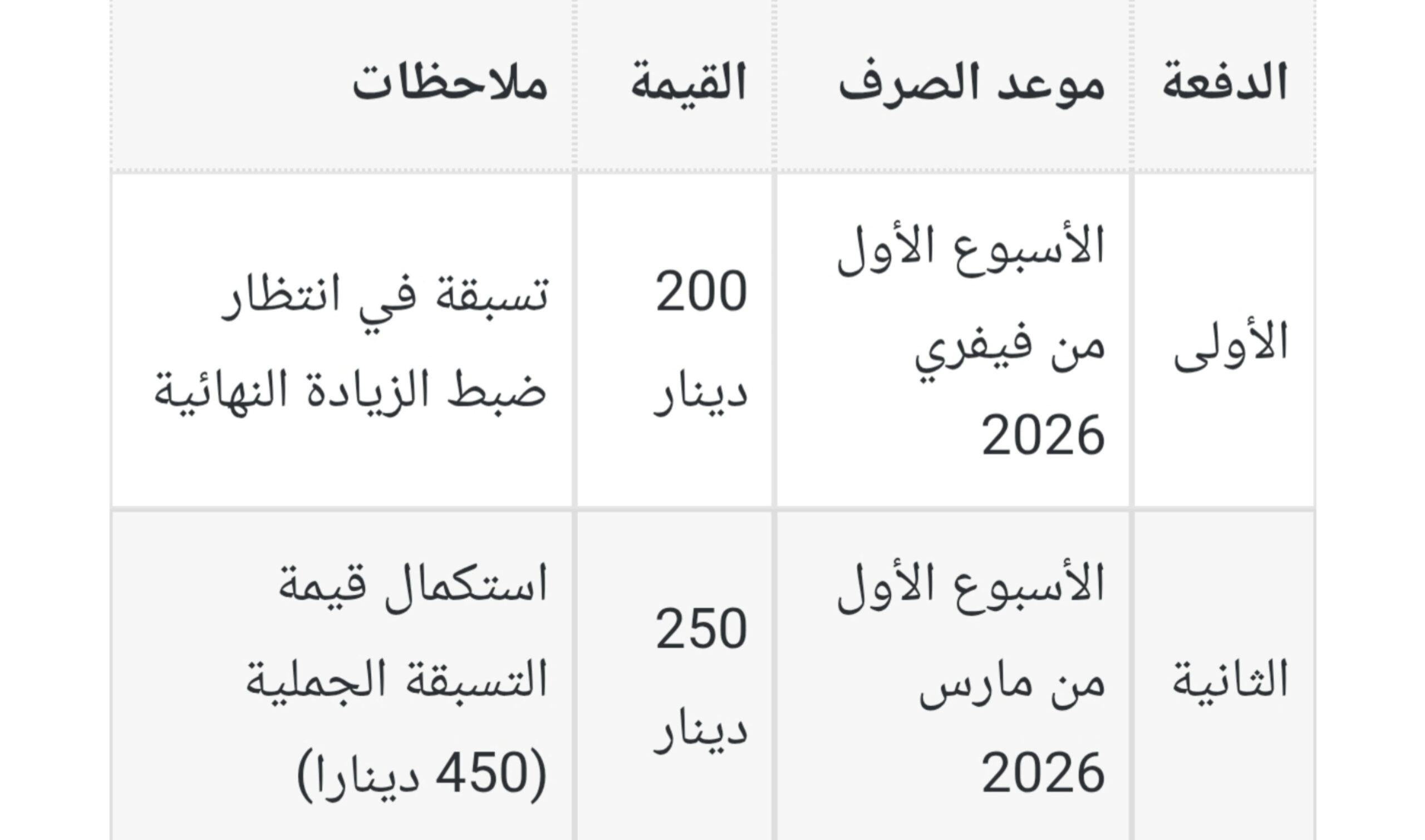 حسب ما تم الإعلان عنه، فإن التسبقة ستُصرف بقيمة جملية تبلغ 450 دينارا، موزعة على قسطين، بما يضمن انطلاق الانتفاع فعليًا قبل صدور الأمر الحكومي المحدد لقيمة الزيادة.