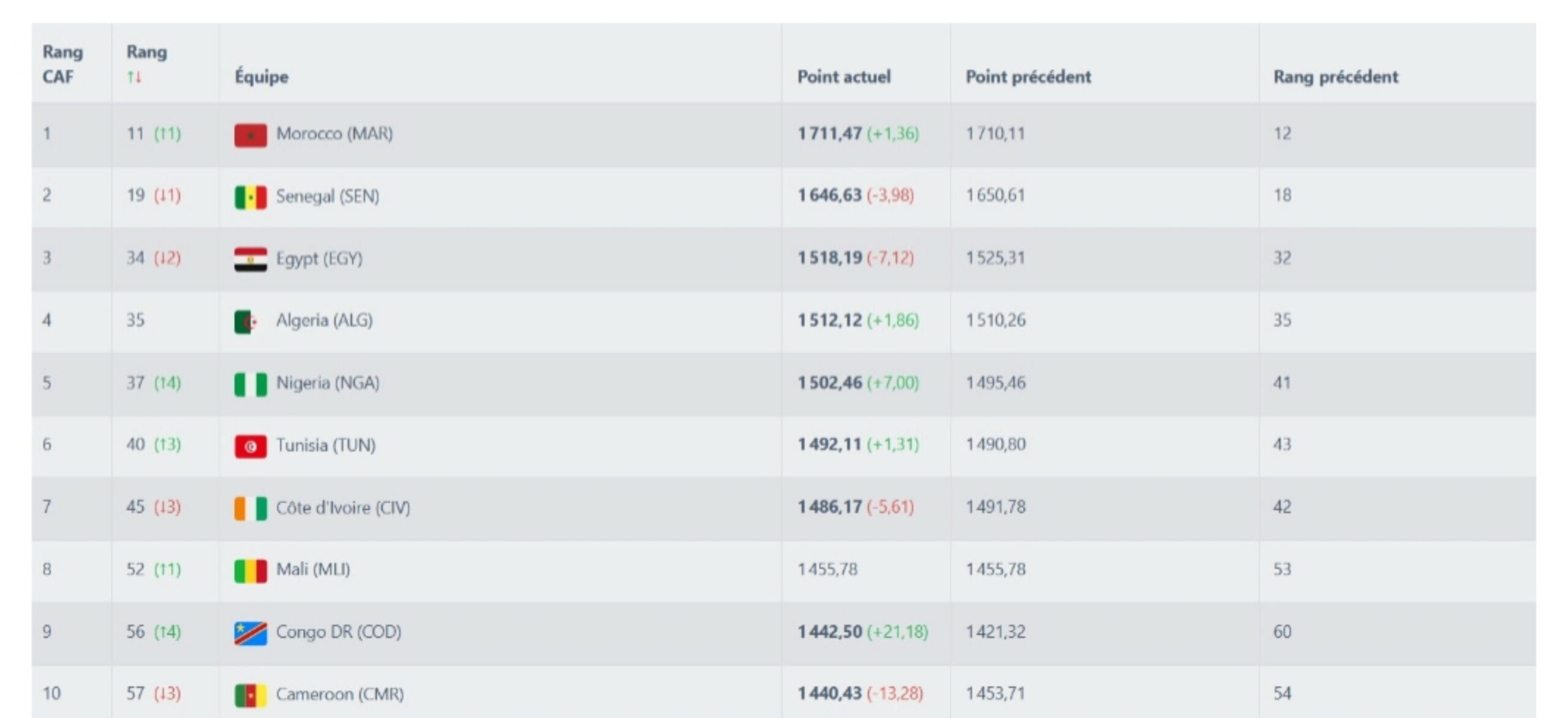 وحافظ المنتخب المغربي على صدارة ترتيب المنتخبات الإفريقية، وأصبح يحتل المركز الـ11 عالميا والأول عربيا وإفريقيا.