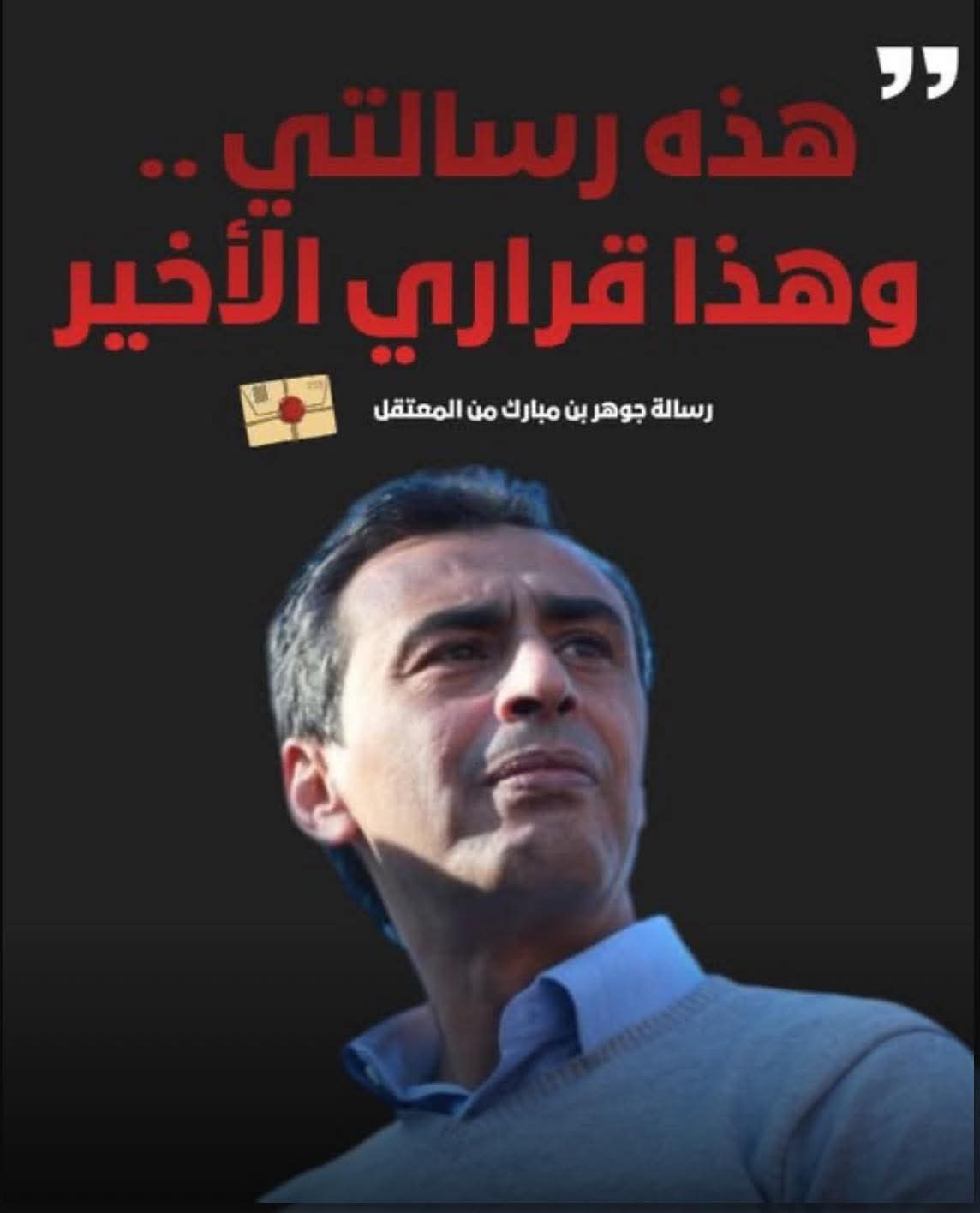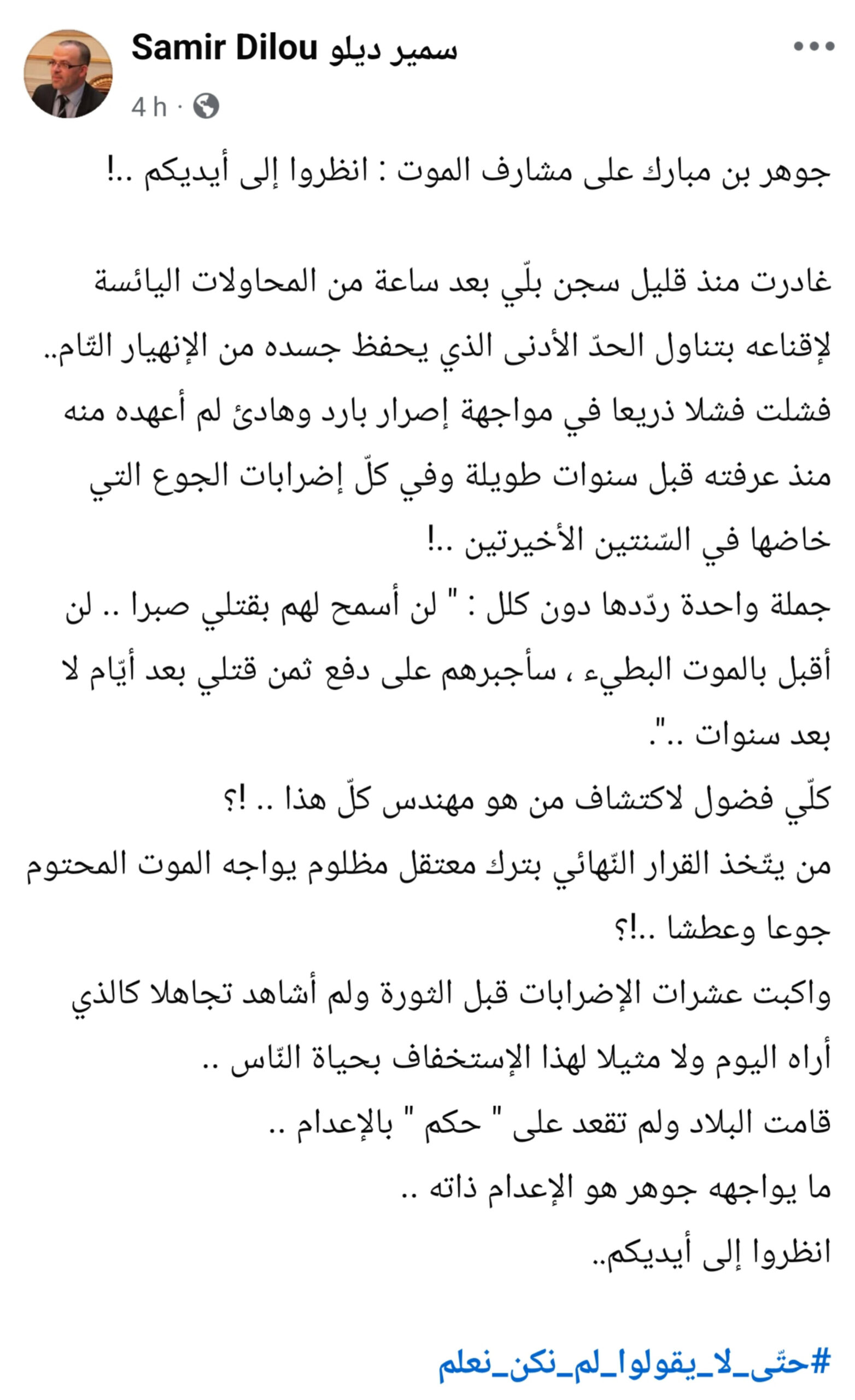 وأشار المحامي إلى أن ما يواجهه جوهر بن مبارك هو الإعدام ذاته مستنكرا ما وصفه بترك معتقل مظلوم يواجه الموت المحتوم جوعا وعطشا، وفق نص التدوينة.