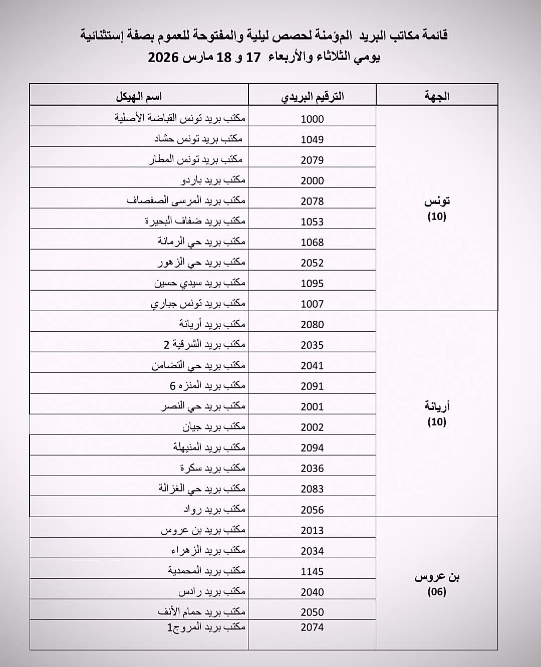 وأوضح البريد التونسي أن مكاتب البريد المعنية ستستقبل المواطنين خلال الفترة الليلية ابتداء من: