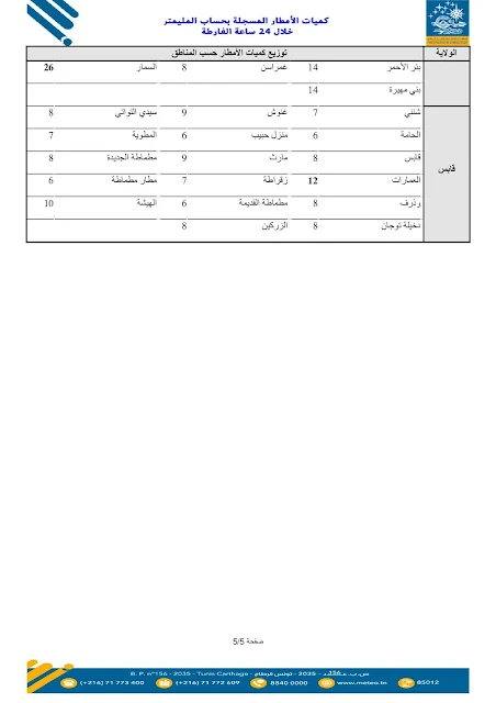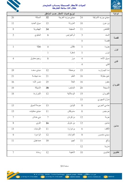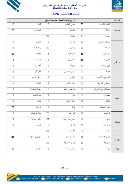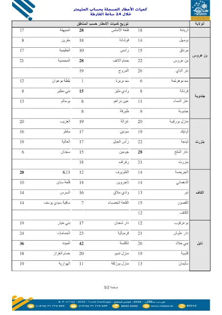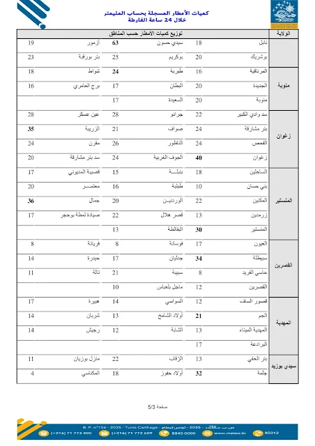وأوضح المعهد أنّ هذه الأرقام تمثّل كميّات الأمطار التي تمّ رصدها بمحطّات القياس المنتشرة بعدد من الولايات، وهي معطيات أوّلية تُنشر بصفة دورية لإعلام المواطنين بوضعية التساقطات وتوزّعها الجغرافي.