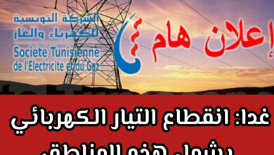 غدا: انقطاع التيّار الكهربائي بعدد من المناطق أعلنت الشركة التونسية للكهرباء والغاز (إقليم صفاقس) عن انقطاع التيار الكهربائي يوم غد…